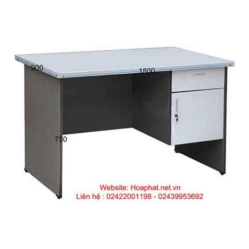 Bàn ghi chì HP180HL là bàn làm việc có hộc liền 1 ngăn kéo 1 cánh mở. Mặt gỗ công nghiệp phủ Melamine màu ghi sáng, dày 25mm, có nẹp bo. Chân bàn và yếm PVC màu xám chì, dày 18mm.