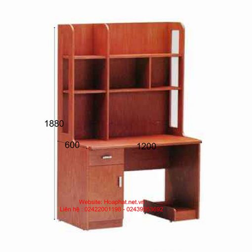 Bàn liền giá sách.phía trên có giá chia khoang để tài liệu,phía dưới bên trái là hộc liền 1 ngăn kéo + 1 cánh mở,bên phải có kệ để CPU