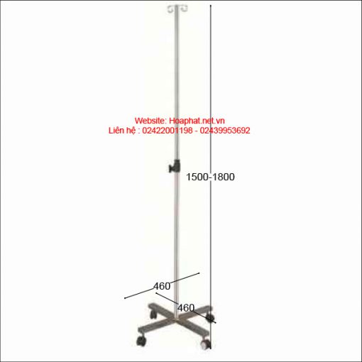Cọc truyền y tế có 2 tai treo để treo chai dung dịch. Thân cọc sử dụng ống Inox Ø25.4 mm, chia làm 2 phần, có cơ cấu tăng chỉnh chiều cao. Phần chân hộp Inox vuông 20 x 40 mm, sử dụng 4 bánh xe di chuyển dễ dàng và có bộ phận hãm bánh xe.
