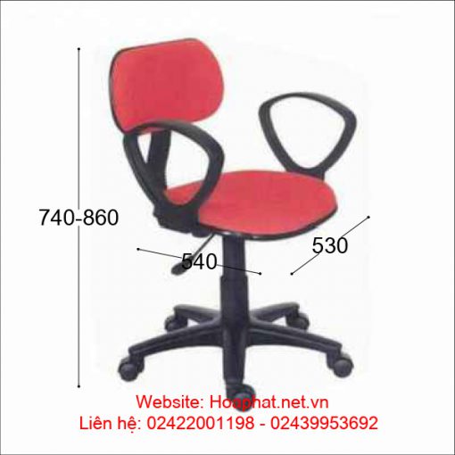 Ghế xoay, tay nhựa, cần hơi điều chỉnh độ cao thấp, đệm tựa mút bọc nỉ, chân nhựa có bánh xe để di chuyển.