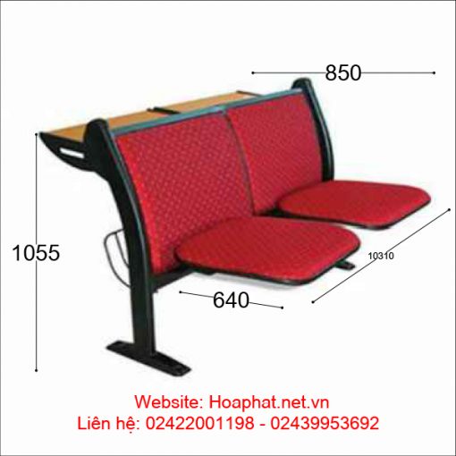 Ghế khung thép ống oval 35×80, sơn tĩnh điện mầu đen. Bàn gỗ nằm sau lưng, đệm tựa bọc nỉ cốt cong, đệm lật lên khi không sử dụng, có giá sắt để đồ phía sau. Chân và xà hàn cứng.