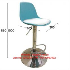 Ghế quầy bar có đệm tựa và thanh để chân liền. Chân đế dập, sắt mạ. Có thể tăng chỉnh độ cao. Đệm tựa cốt gỗ dán giấy, sơn phủ.