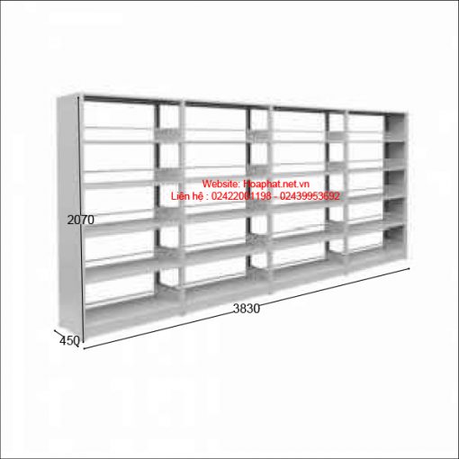 Giá sách sắt GS5K4 gồm 4 khoang sử dụng 2 mặt, có 5 tầng (Kể cả đợt đáy), có ốp hồi kín, đợt di động, có thanh chắn giữa điều chỉnh được độ cao. Thanh chắn sách bên cạnh được hàn trực tiếp vào trụ. Mỗi đợt chịu tải được 40kg.