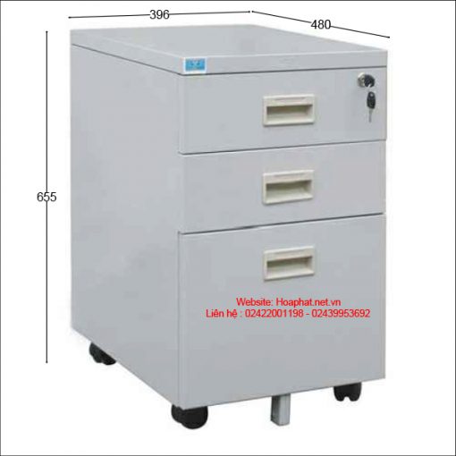 Hộc di động HS1 là hộc sắt, ray bi, có 3 ngăn kéo, 2 ngăn nhỏ phía trên, 1 ngăn lớn phía dưới, sơn màu ghi.