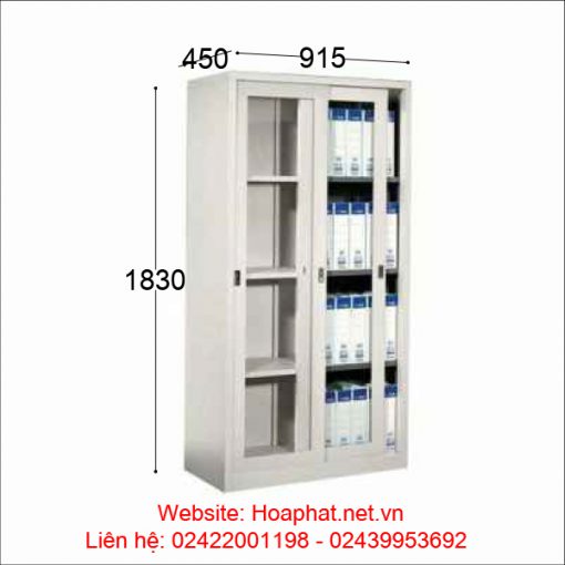 Tủ sắt sơn tĩnh điện màu ghi, có 1 khoang gồm 3 đợt di động, sử dụng 2 cánh khung kính lùa, 2 cánh gương được chuyển động nhờ bánh xe treo trên nóc và dẫn hướng nhờ rãnh ở đáy, tay nắm nhựa, 1 khóa.