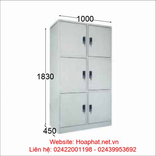Tủ sắt sơn tĩnh điện màu ghi, có 1 khối gồm 6 khoang đều nhau. Mỗi khoang có 1 cánh sắt mở, 1 tay nắm nhựa liền khóa.