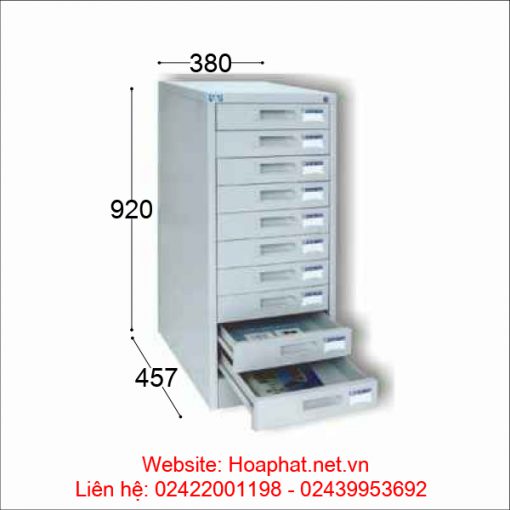 Tủ sắt sơn tĩnh điện màu ghi, có 1 khối gồm có 10 ngăn kéo đựng tài liệu, kẹp file, sử dụng khóa dàn, mỗi khoang kéo có 1 tay nắm nhựa.