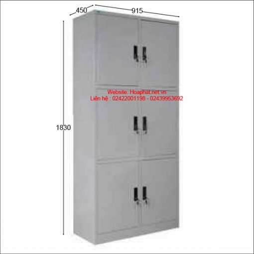 Tủ sắt sơn tĩnh điện màu ghi, có 1 khối gồm 6 khoang đều nhau. Mỗi khoang có 1 cánh sắt mở, 1 tay nắm nhựa liền khóa.