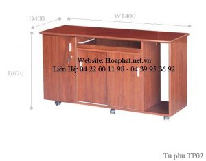 Tủ phụ TP02 có chiều cao bằng các mặt bàn tương ứng (760). Tủ phụ di động, có khoang cánh mở bên trái, bên phải khoang để CPU, ở giữa có bộ cánh lùa và bàn phím. Chân tủ có bánh xe di chuyển.