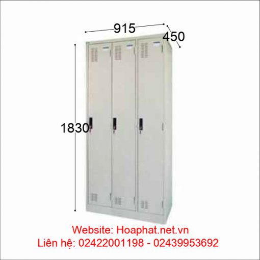Tủ sắt sơn tĩnh điện màu ghi, có 1 khối gồm 3 khoang, 3 cánh sắt mở sử dụng khóa locker liền tay nắm, mỗi khoang có 1 đợt cố định, 1 suốt treo áo.