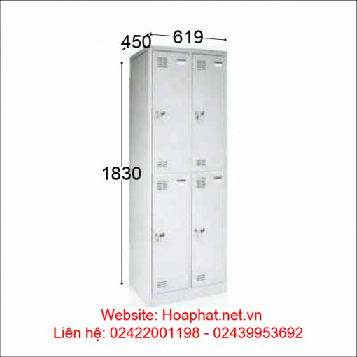 Tủ sắt sơn tĩnh điện màu ghi, có 1 khối gồm 4 khoang, 4 cánh sắt mở sử dụng khoá locker, mỗi khoang có 1 đợt cố định, 1 suốt treo áo.
