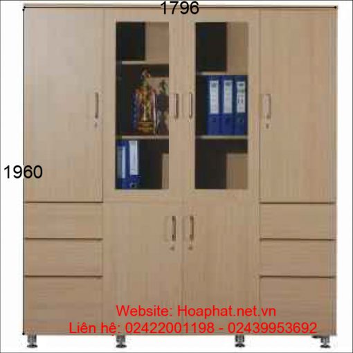 – Phía trên 2 bên có khoang cánh đặc 1 khoang để tài liệu + 1 khoang để quần áo, 2 khoang giữa: khung gỗ cánh kính để file tài liệu.