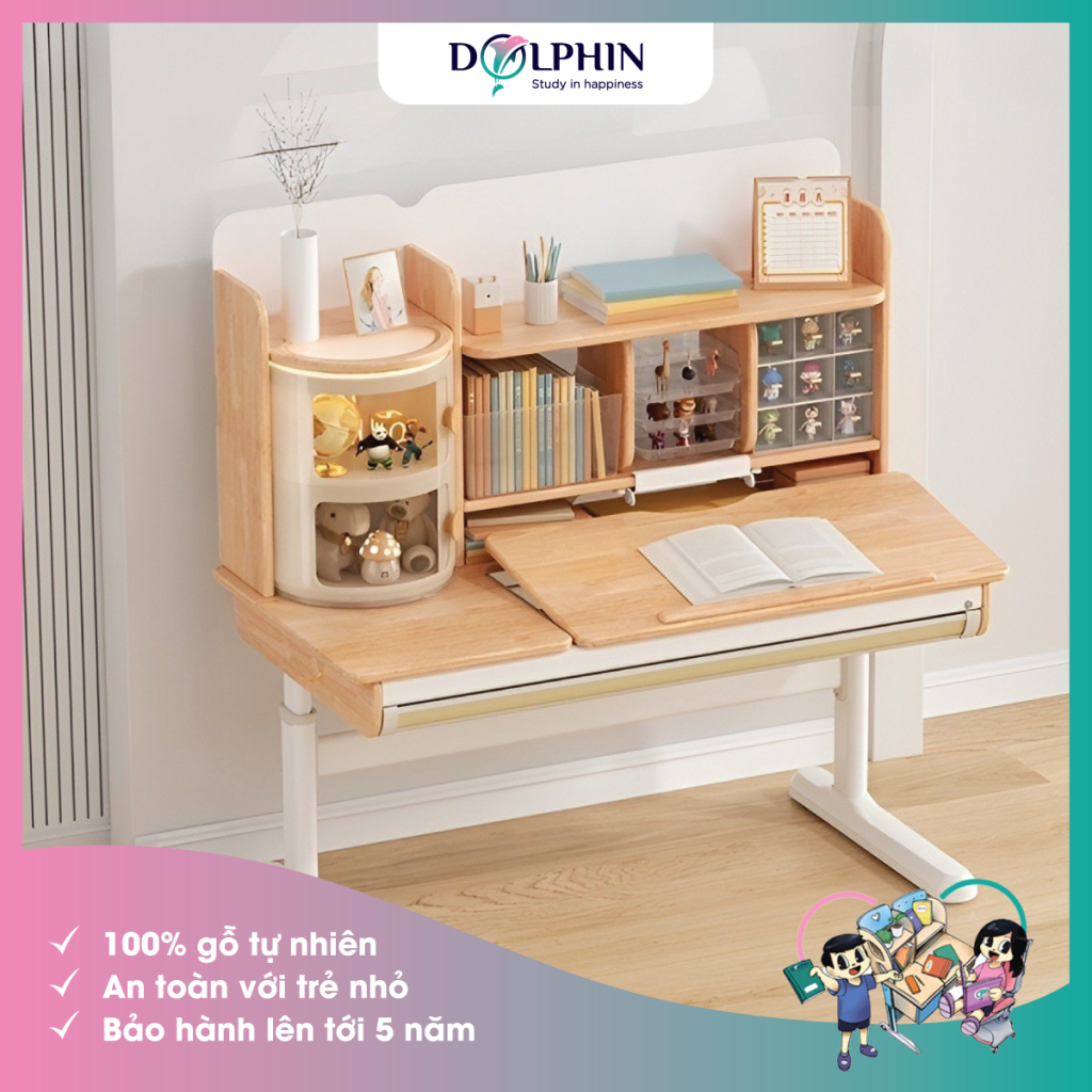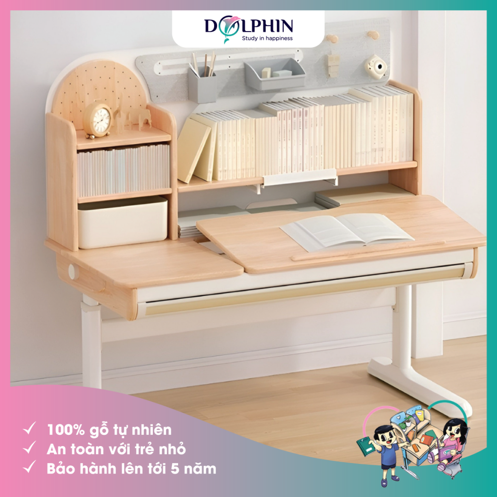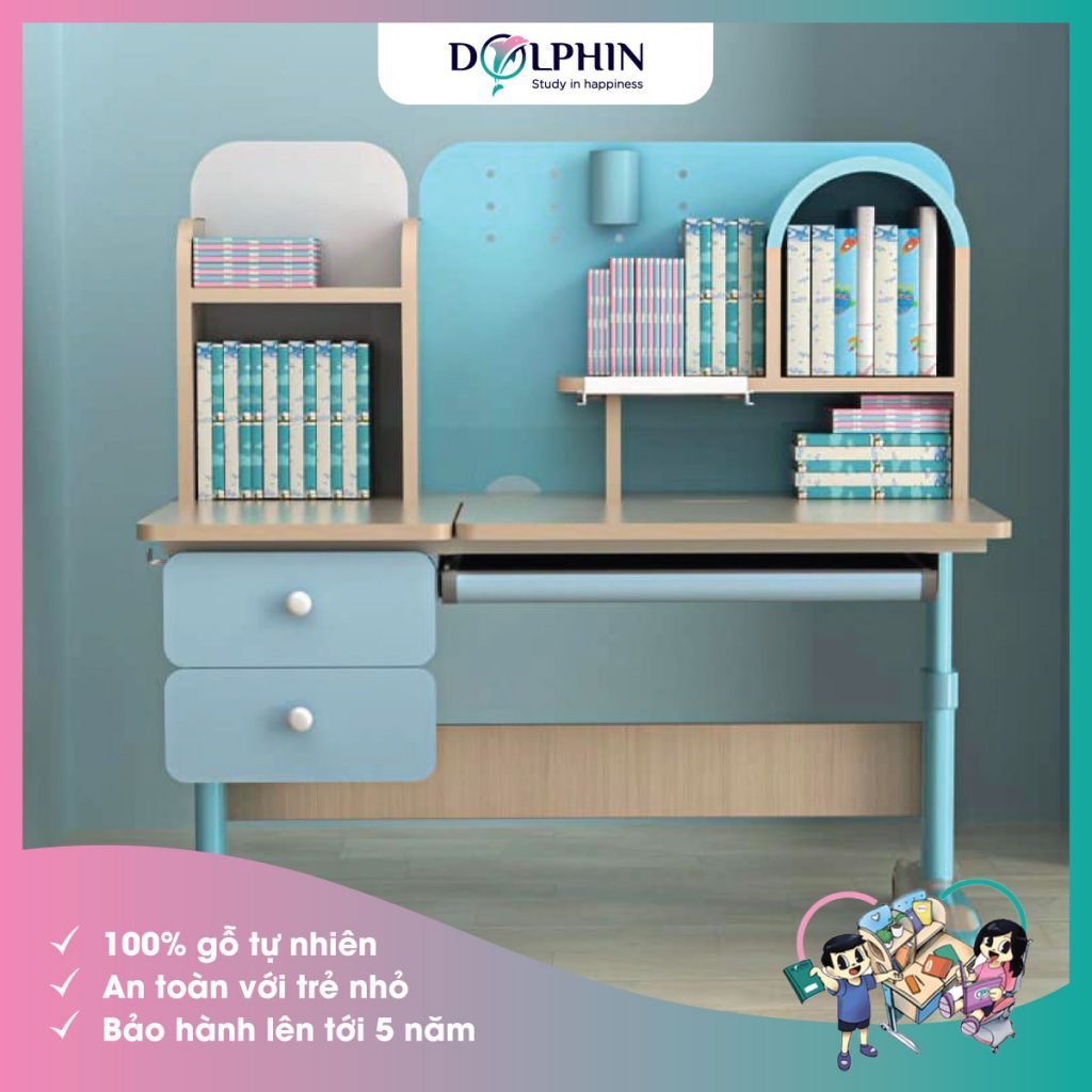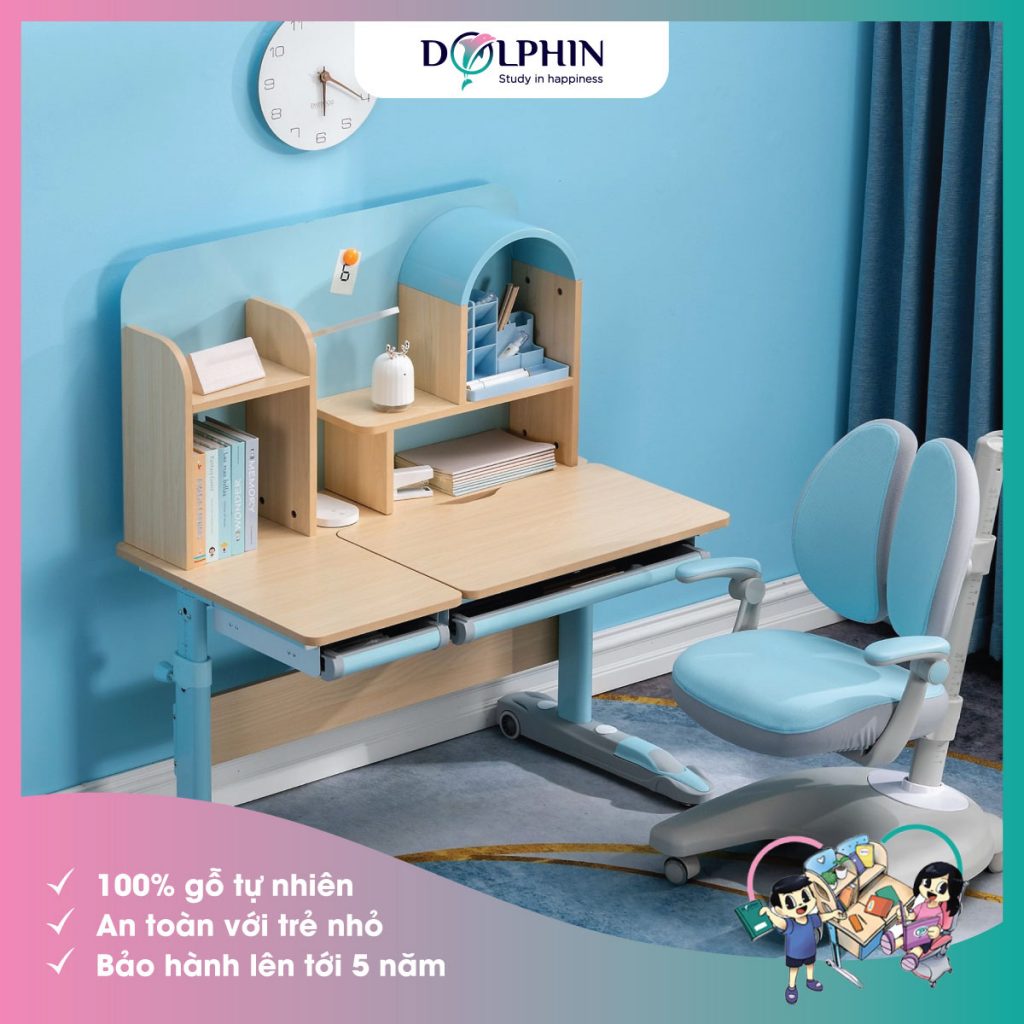 Bàn học DOL-12 – Mặt bàn làm từ gỗ cao su tự nhiên, mặt gỗ sinh thái nguyên bản cộng thủ chất lượng “vật liệu xanh”. Tốc độ thải formaldehyde chỉ bằng 0,01mg/l, đảm bảo theo tiêu chuẩn F4 Nhật Bản (≤ 0,3mg/l) vô cùng an toàn với bé.